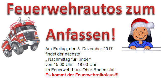 Am 08.Dezember ist es soweit. Der letzte offene Nachmittag des Jahres 2017 steht an. Auch dieses Jahr wird die Tradition fortgesetzt und der Feuerwehr-Nikolaus kommt uns besuchen. Natürlich können wie gewohnt die Fahrzeuge und Gerätschaften der Feuerwehr angeschaut werden und auch die beliebten Rundfahrten in den Feuerwehrautos finden wieder statt. Es wird Kaffee, Waffeln und Kinderpunsch geben und das Ende rückt eine Stunde nach hinten, also dieses Mal bis 18:00 Uhr!